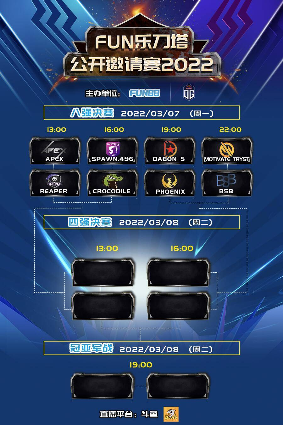 强者与强者的对决会碰撞出怎样的火花呢?由OG主办, FUN88赞助协办的FUN乐刀塔公开邀请赛2022即将于北京时间3月7日-3月13日热血开战,这一次是激情的碰撞,是梦想的起飞,是热血的沸腾,届时以上的王牌劲旅们将再一次为了荣耀而战。